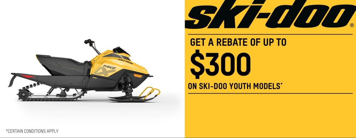 Until supplies last. Returns of any portion of the purchase will require equal forfeiture of offer or amount equal to the offer. Eligible models are all new and unused 2026 Youth snowmobiles. Other Snowmobile models may qualify for other promotions, see local dealers for details. † Get a $300 rebate : Consumers who purchase a new and unused 2026 Youth Ski-Doo model during the promotional period are eligible for a $300 rebate. Carefully read the operator's guide and safety instructions. Observe applicable laws and regulations. All adult snowmobile models are intended for drivers aged 16 and older. Always wear appropriate protective clothing, including a helmet. Riding and alcohol/drugs don’t mix. Always ride responsibly and safely. See your authorized BRP dealer for details and visit https://ski-doo.com/.
