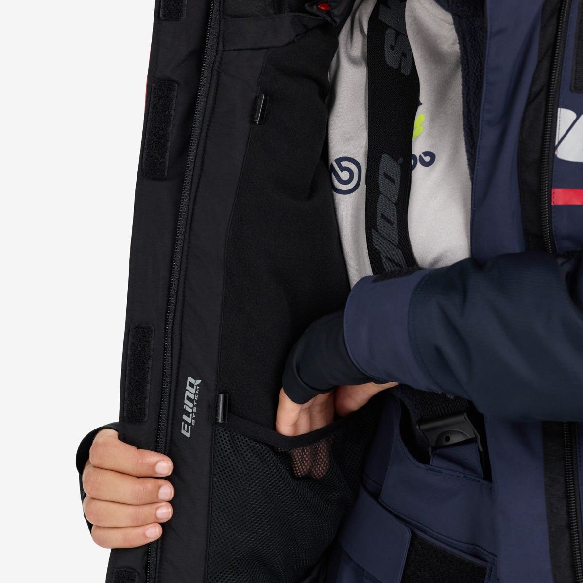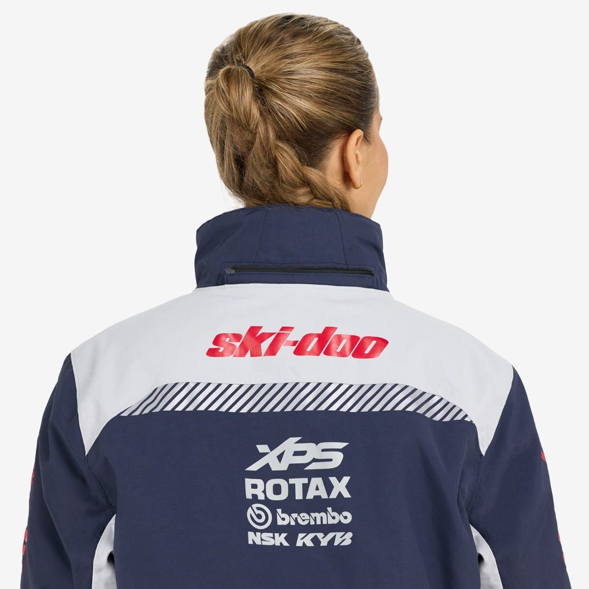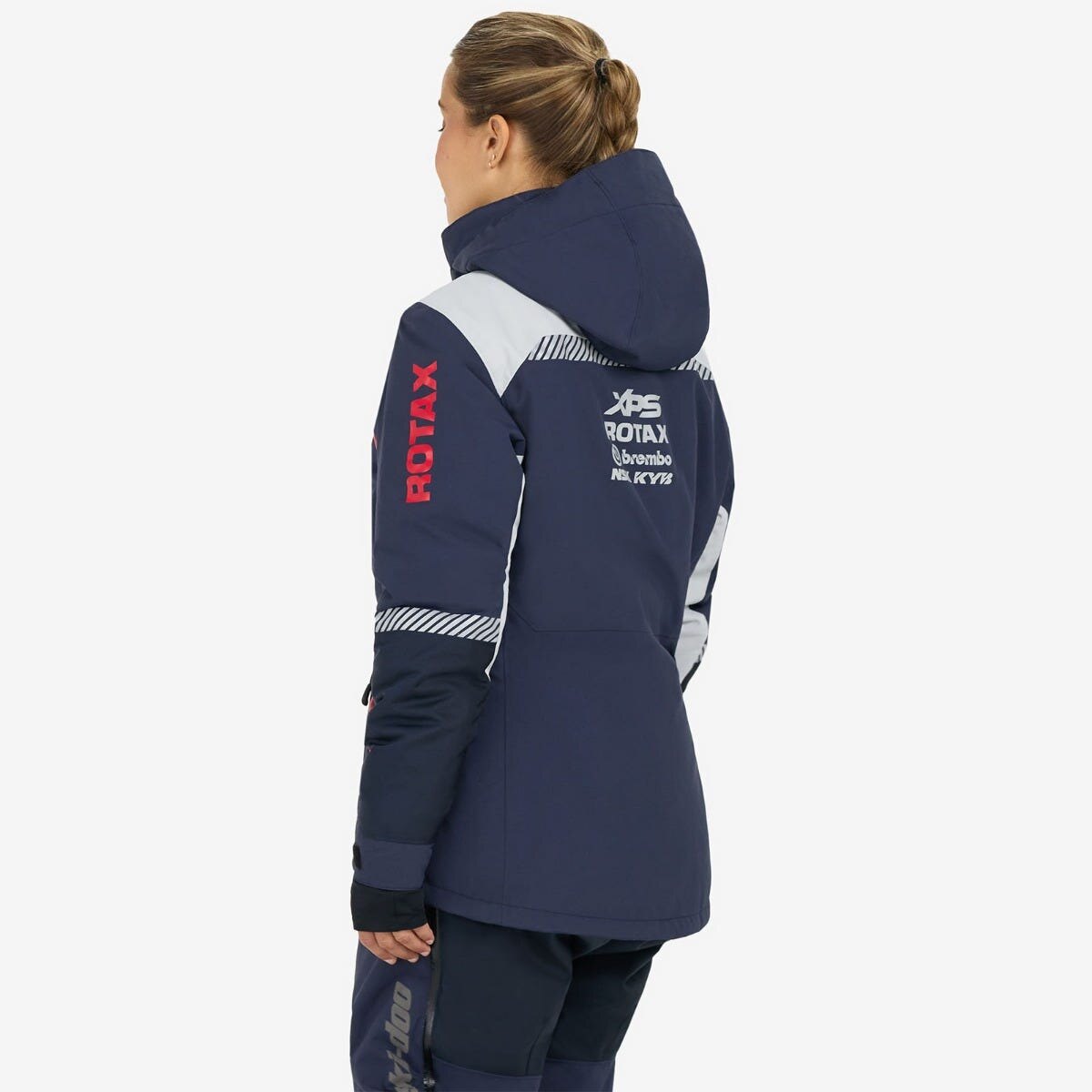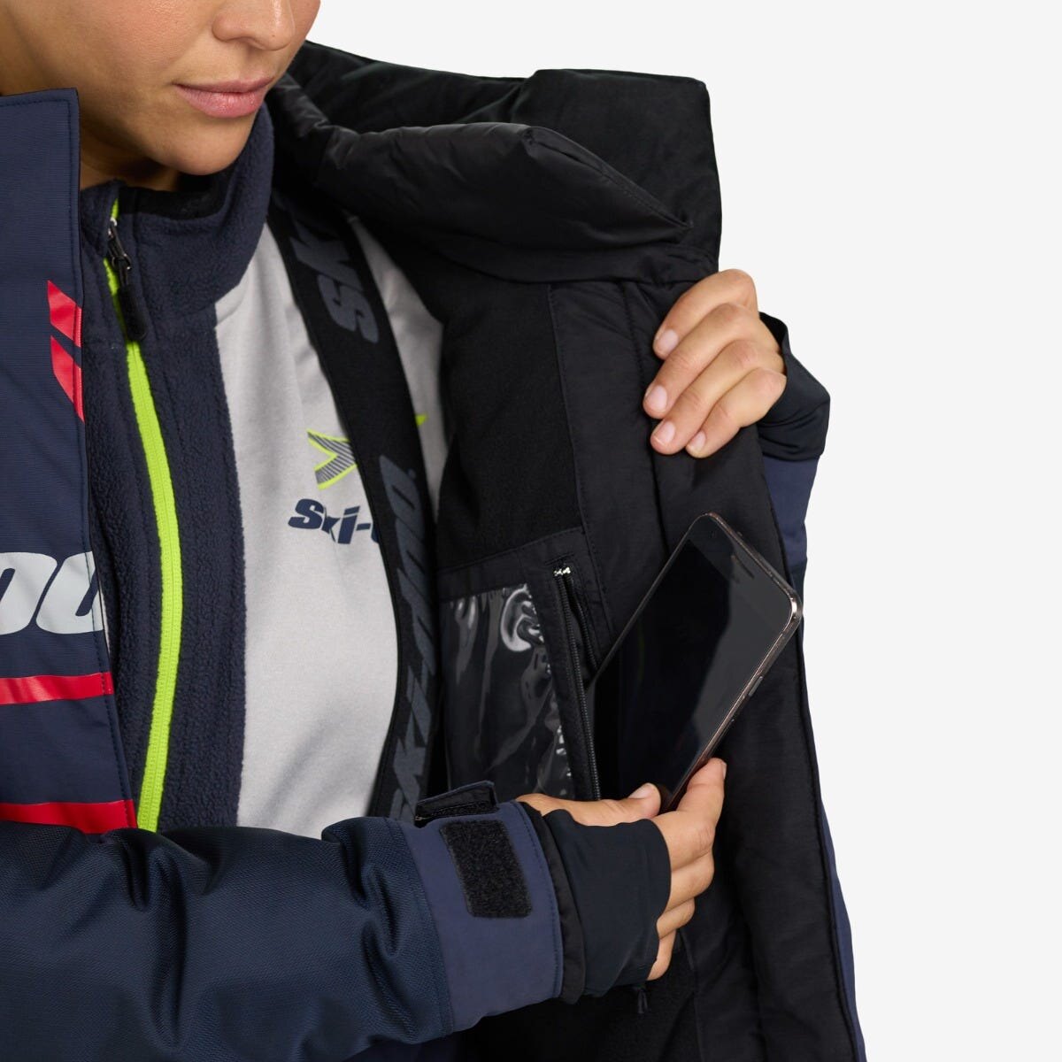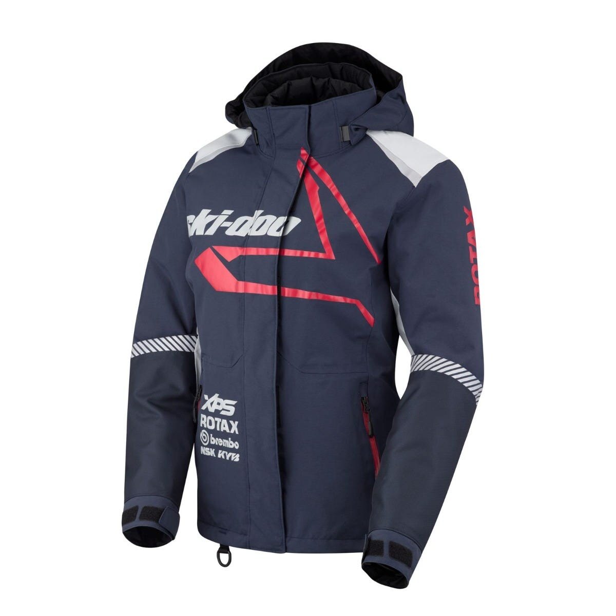 A plethora of tech features make the Women\'s Ski-Doo X-Team Jacket a go-to when you\'re in need of warmth on the trails. Built tough with 100% waterproof coverage, breathability and windproof protection, this jacket keeps the elements from interrupting your ride. 200g of PrimaLoft® Black insulation teams up with Radiant Core technology to hold in warmth, while the 100% sealed seams and logos and insulated double center front flap keep out moisture and icy winds. Multiple pockets including two hand pockets, one Napoleon pocket with chamois and one inner mesh pocket ensure your essentials are safe, while the allover reflectivity gets you noticed even in low light. Take on the trails with fashion, functionality, and warmth on your side in this standout jacket.
